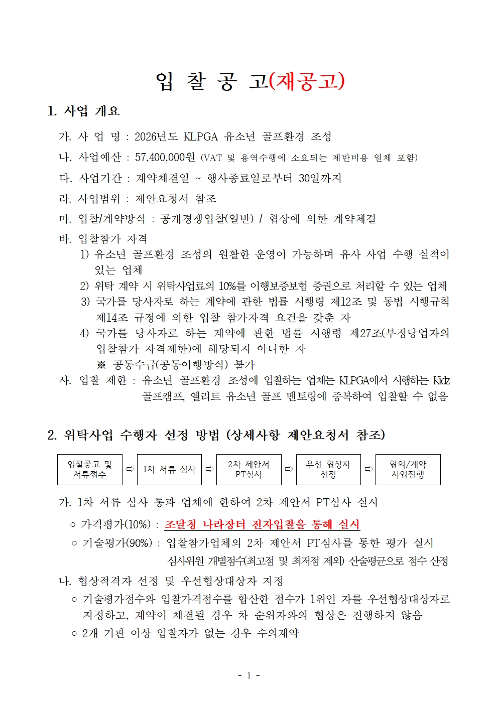 2026년 KLPGA 엘리트 유소년 골프 멘토링 위탁업체 입찰 공고(재공고)