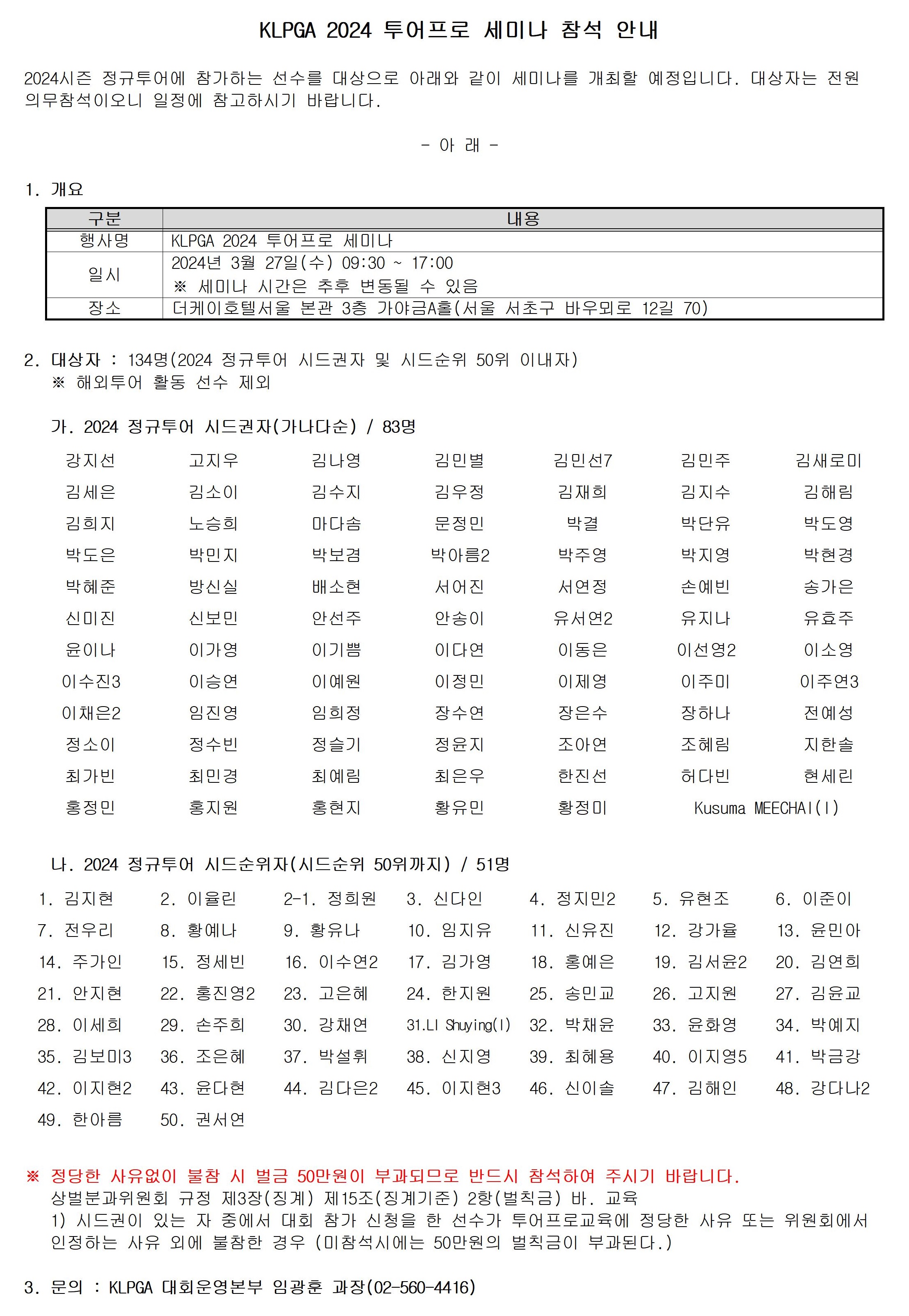 KLPGA 2024 투어프로 세미나 참석 안내