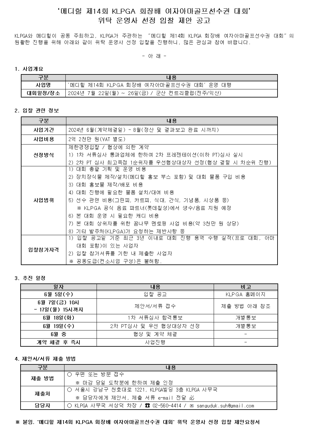별첨. '메디힐 제14회 KLPGA 회장배 여자아마골프선수권 대회' 위탁 운영사 선정 입찰 제안요청서(0605 - 최종).hwp