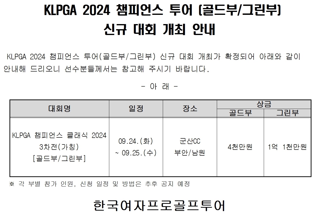 KLPGA 2024 챔피언스 투어(골드부/그린부) 신규 대회 개최 안내