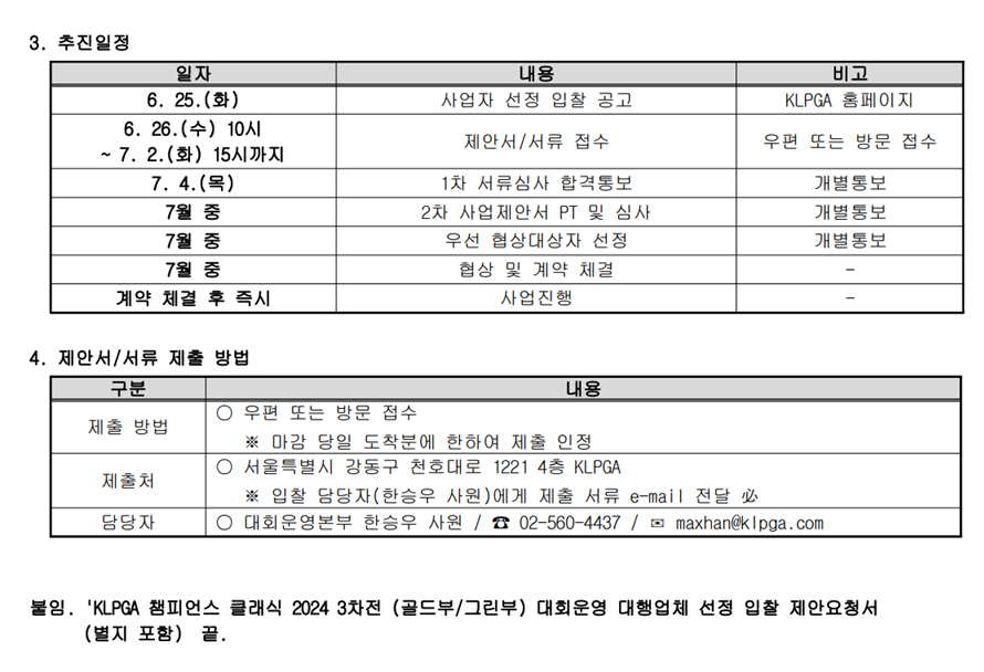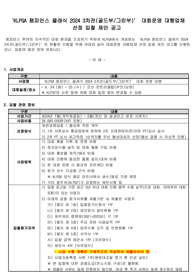 붙임. 'KLPGA 챔피언스 클래식 3차전 골드부 그린부' 대회운영 대행업체 선정 입찰 제안요청서(별지 포함).hwp