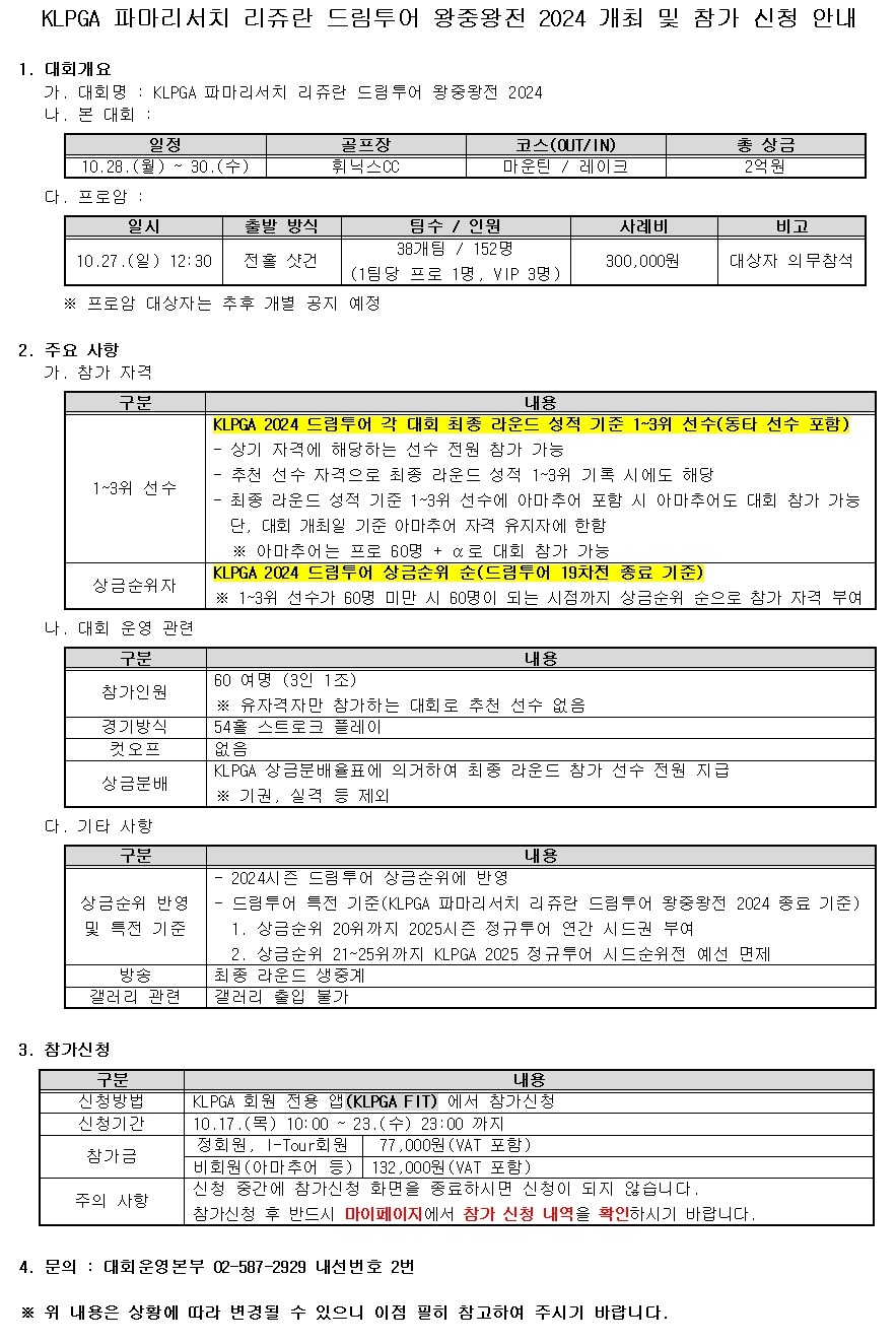 KLPGA 파마리서치 리쥬란 드림투어 왕중왕전 2024 개최 및 참가 신청 안내