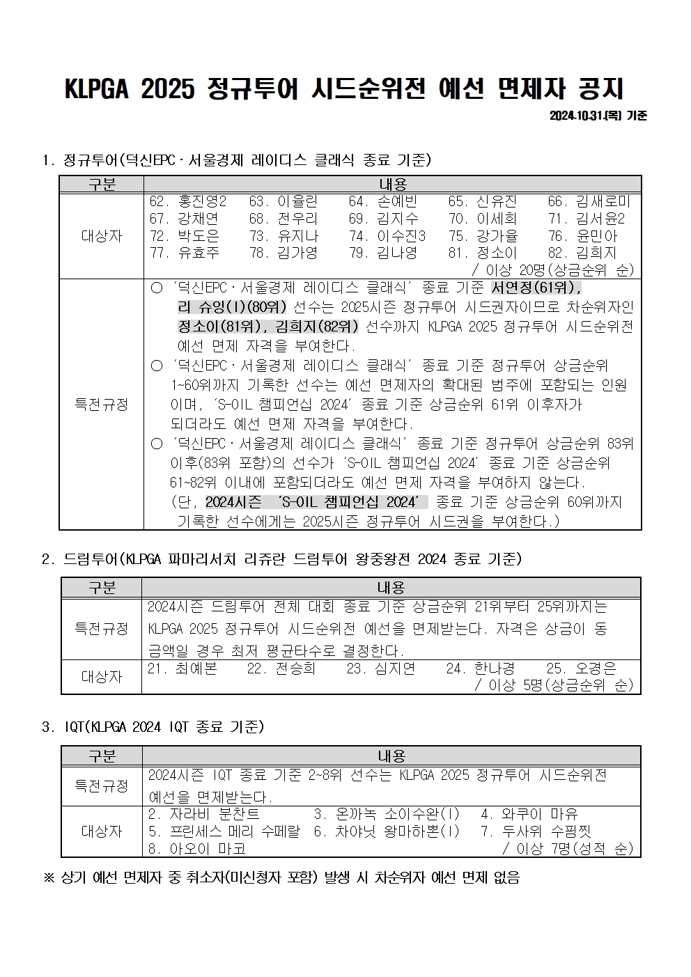 KLPGA 2024 정규투어 시드순위전 예선 면제자 최종 공지(S-OIL 챔피언십 2024 종료 기준)
