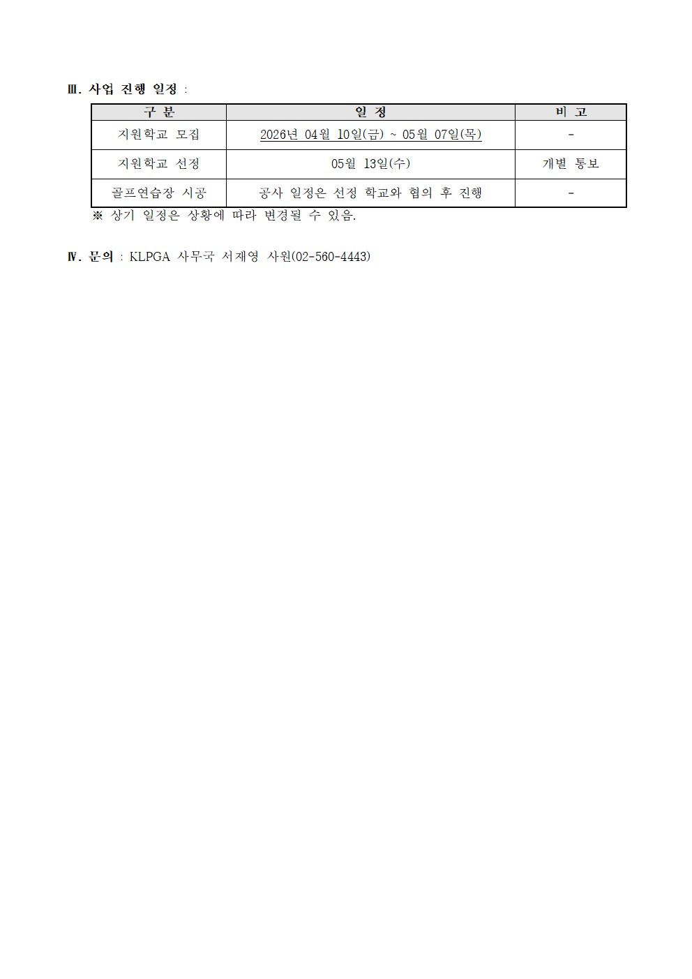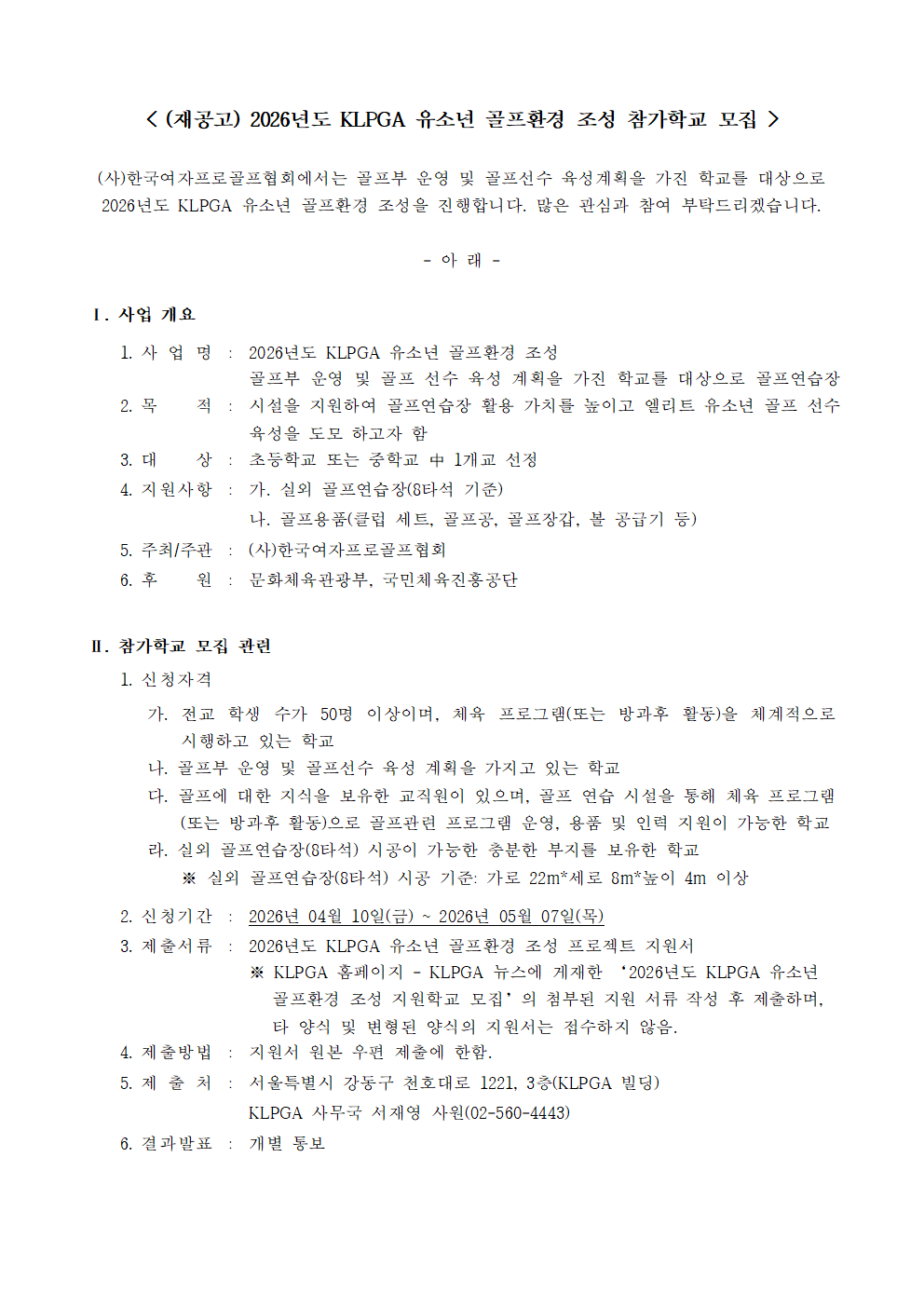 (재공고) 2026년도 KLPGA 유소년 골프환경 조성 참가학교 모집