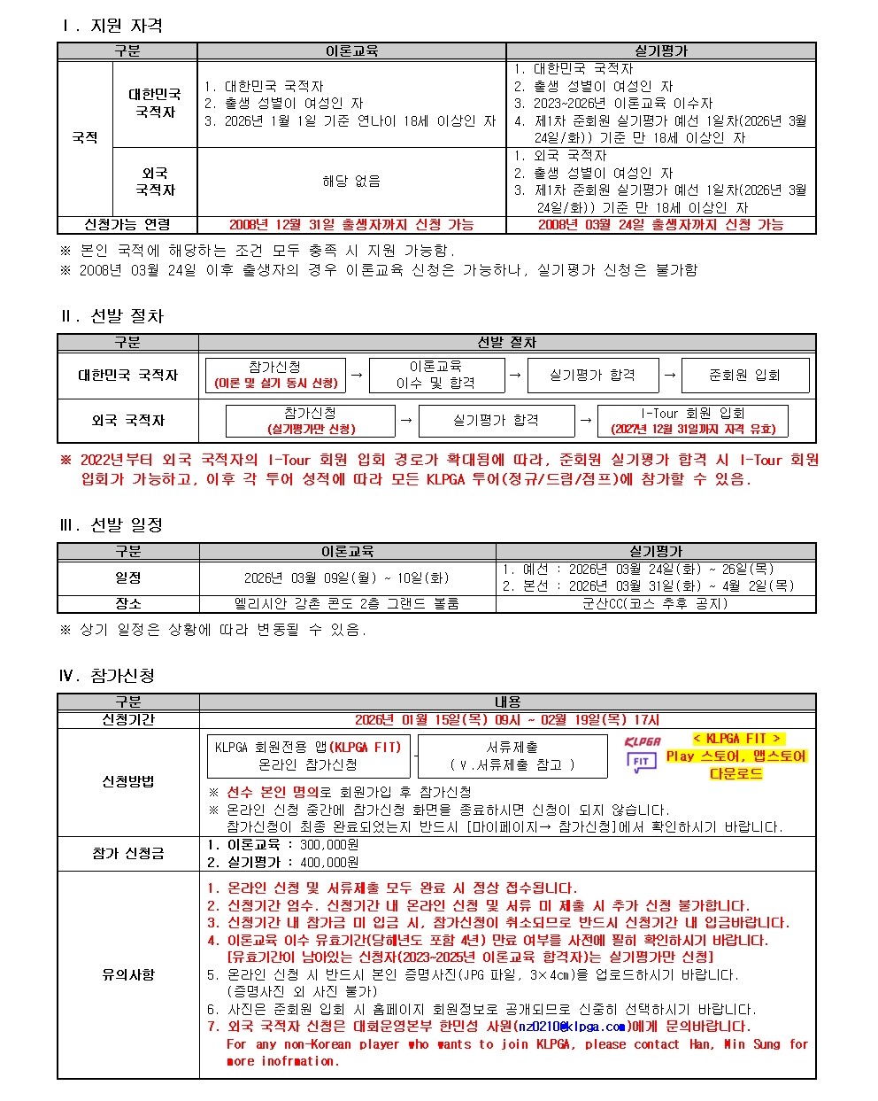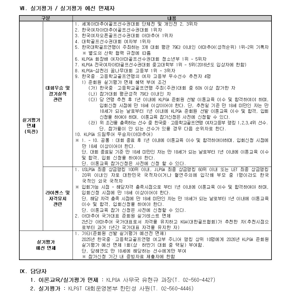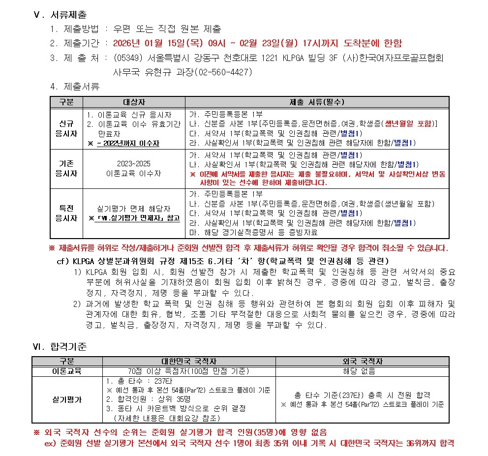 2026년도 KLPGA 신입 준회원 선발(이론교육/실기평가) 참가신청 안내