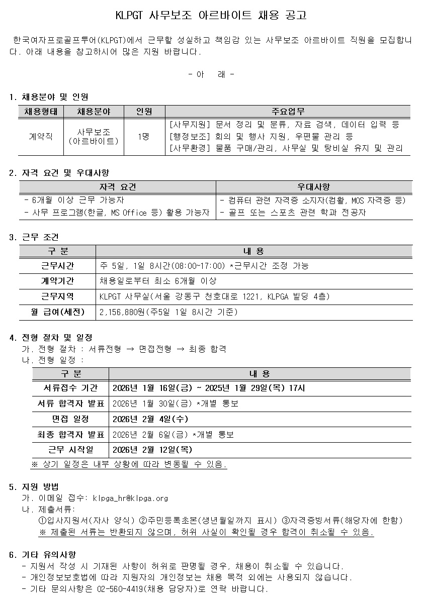 KLPGT 사무보조 아르바이트 채용 공고