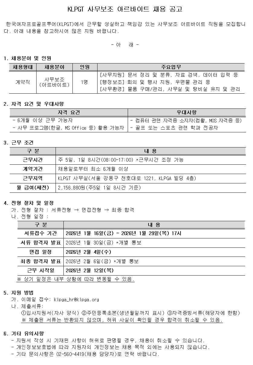 KLPGT 사무보조 아르바이트 채용 공고