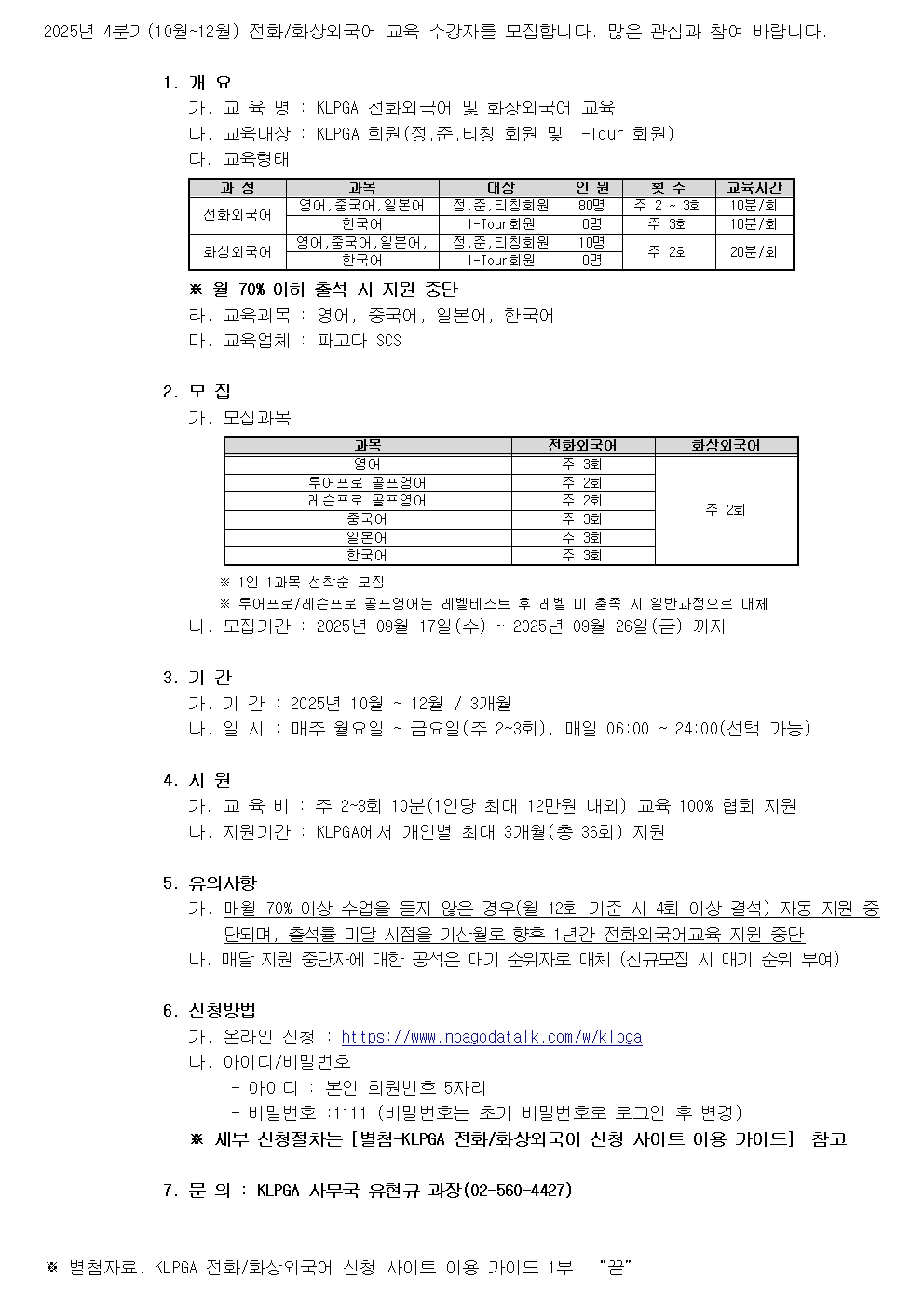 2025년도 KLPGA 전화외국어 및 화상외국어 교육 4분기(2025.10 ~12) 신규 모집
